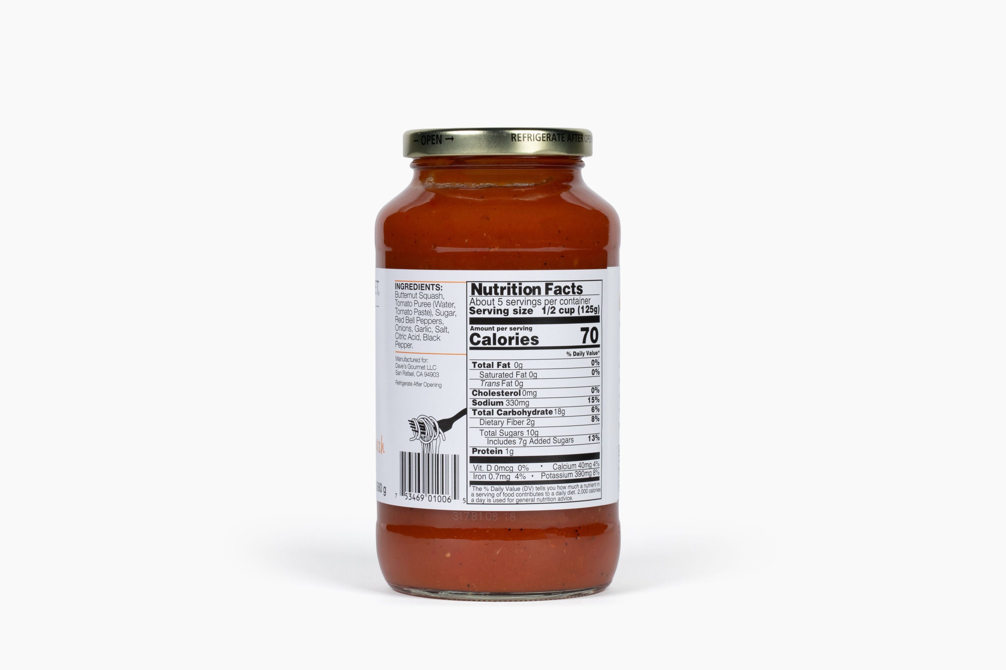 Butternut Squash, Tomato Puree, Sugar, Red Bell Peppers, Onions, Garlic, Salt, Citric Acid, Black Pepper